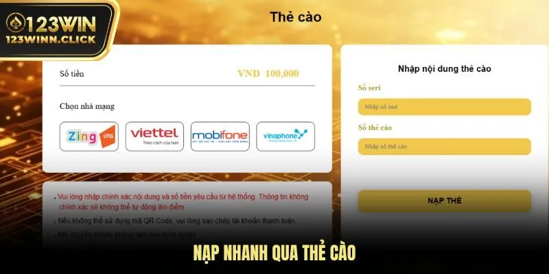 Nhà cái tích hợp kênh nạp tiền 123WIN qua thẻ cào di động phục vụ cho hội viên dễ dàng sử dụng khi cần. Quy trình tiến hành chi tiết được cập nhật bao gồm 03 bước bên dưới đây: