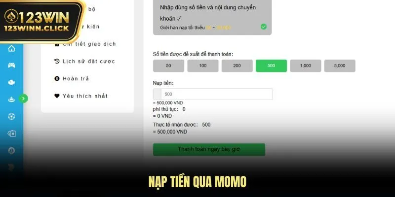 Momo Pay là ví điện tử thông dụng hiện nay nên nhà cái đã hợp tác để giao dịch ngay trên website/app. Hội viên đang sẵn vốn trong ứng dụng thoải mái chuyển sang hệ thống dùng trải nghiệm kho trò chơi đặc sắc lại chất lượng cao. Quy trình nạp tiền 123WIN bao gồm 04 bước như sau: